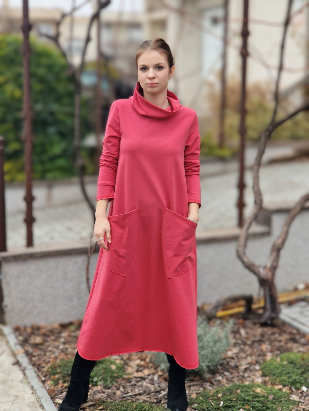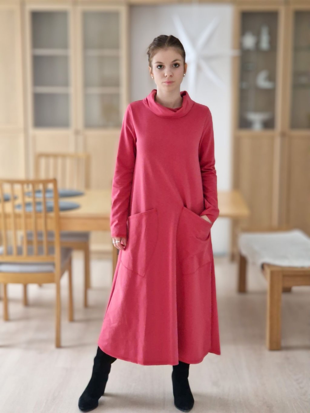 Dámske šaty v strednej dĺžke na chladnejšie obdobie. Šaty AJA sme ušili z elastickej teplákoviny, majú ozdobné a zároveň praktické veľké vrecká, sú ozdobne preštepované a vzadu majú vyšité logo "Ajka". Okolo krku je ležérny padavý rolák. Tento model je strihaný v tvare písmena "A", naspodu sú šaty tvarované do oblúka - smerom nabok sa skracujú, vpredu a vzadu sú o niečo dlhšie.