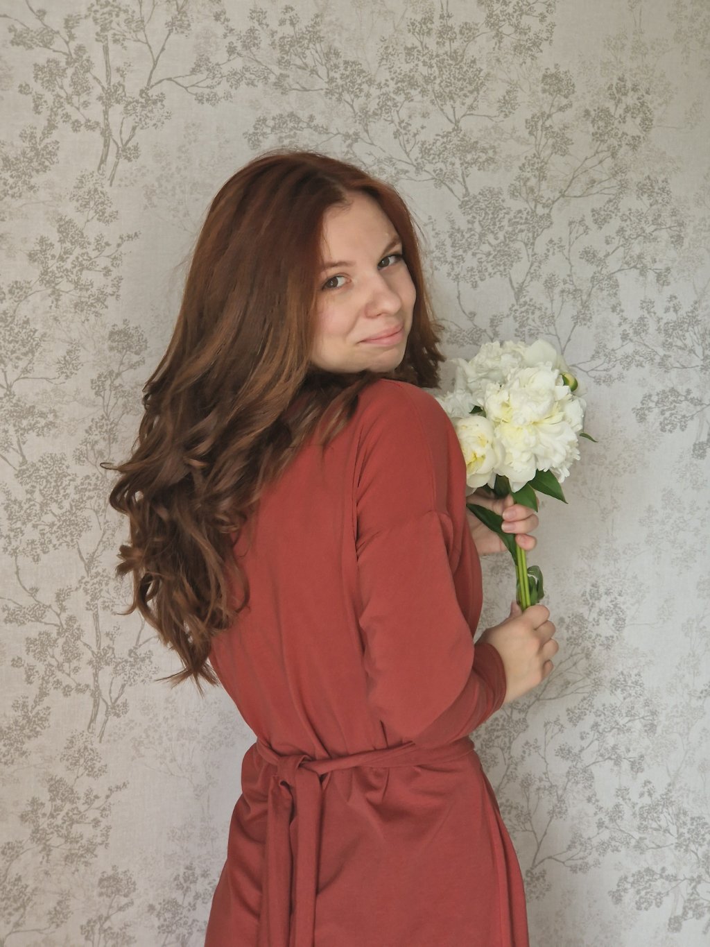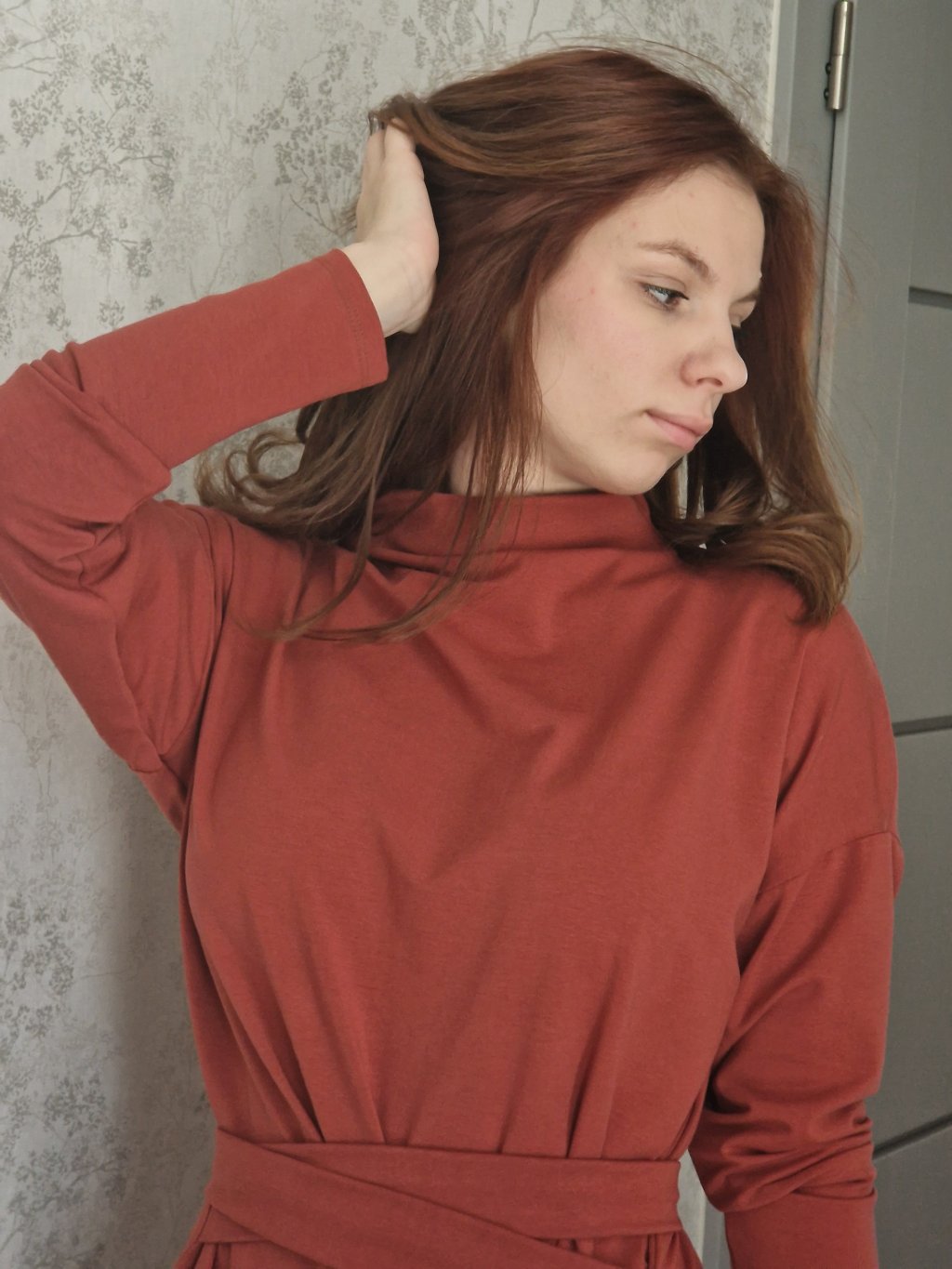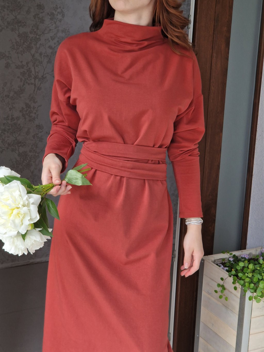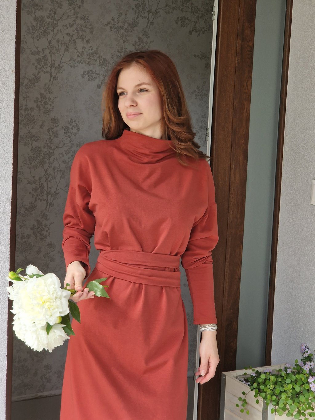 Celia Rust je model, ktorý spája sofistikovanosť s pohodlím. Ušitá z elastického bavlneného úpletu v odtieni zrelej terakoty, elegantne kopíruje siluetu a vďaka dlhému všitému opasku ju môžeš dotvarovať podľa seba – uviaž ho vpredu, vzadu alebo na bok.