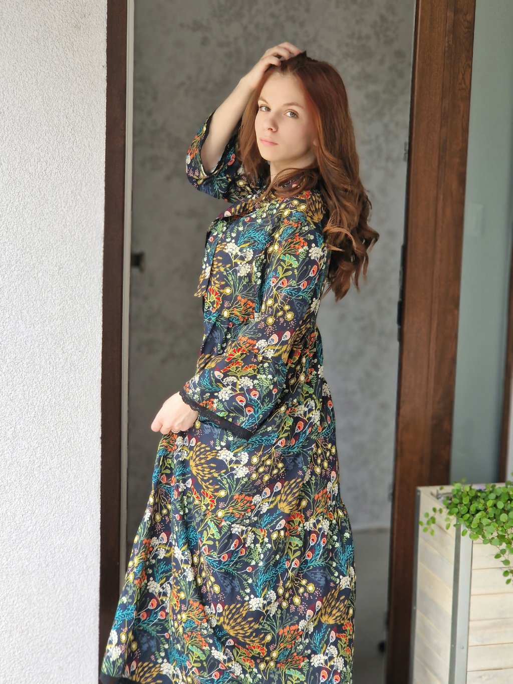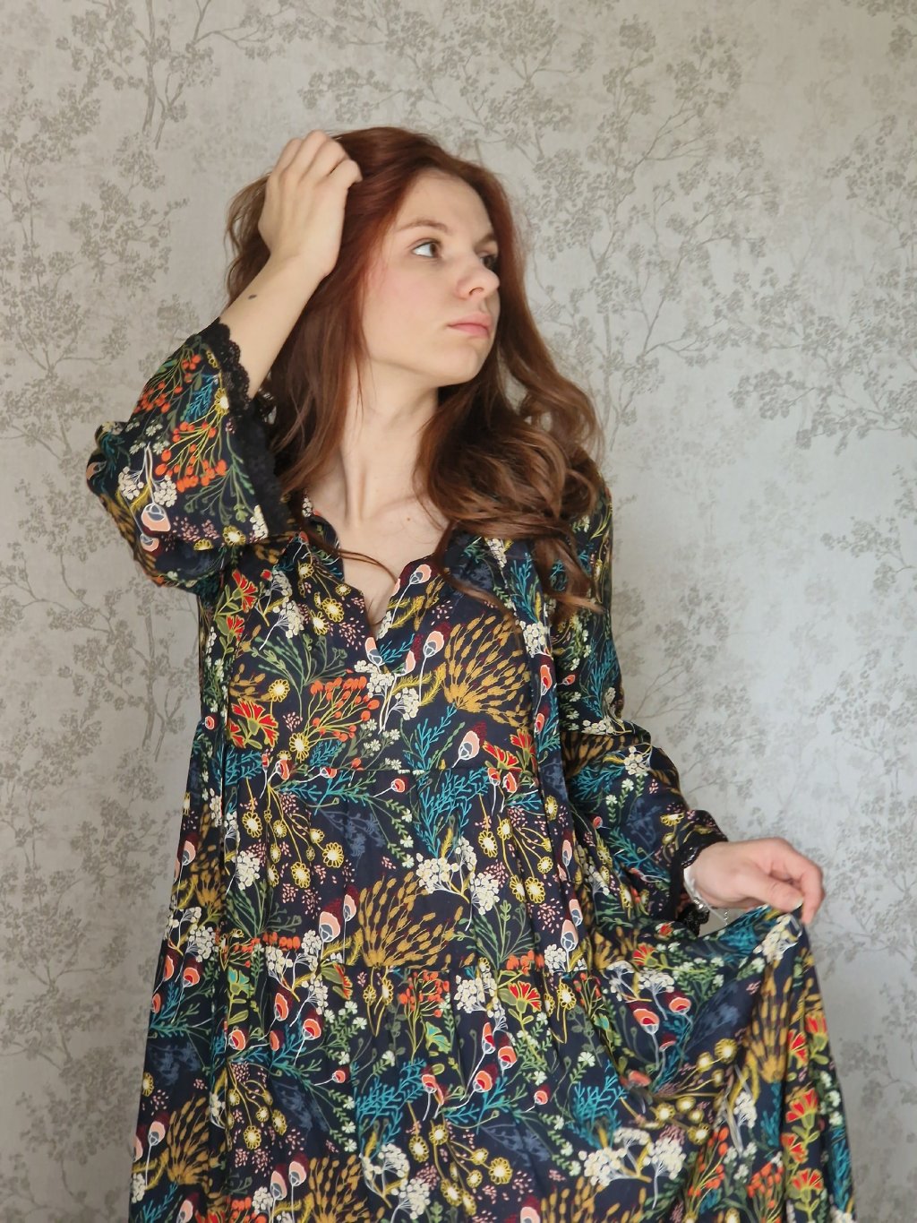 Ušité z viskózy s výraznou botanickou potlačou, pripomínajú záhradu, kde sa stretáva sloboda s eleganciou. Tri riasené volány dodávajú šatám pohyb a ľahkosť, rukávy a spodný lem zdobí jemná čipka. Výstrih s viazačkou ti dá možnosť prispôsobiť si dekolt podľa nálady.